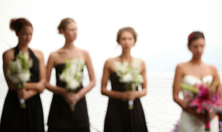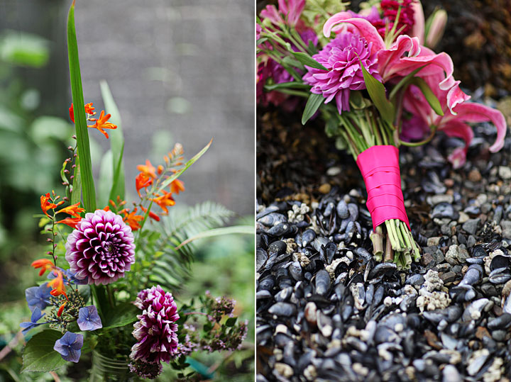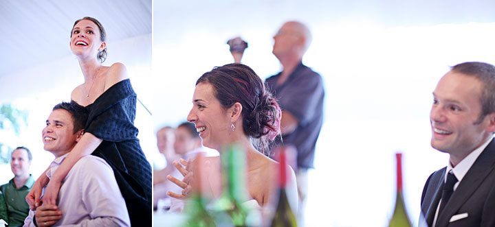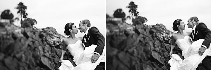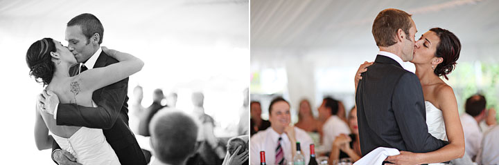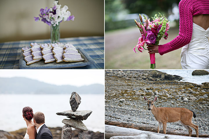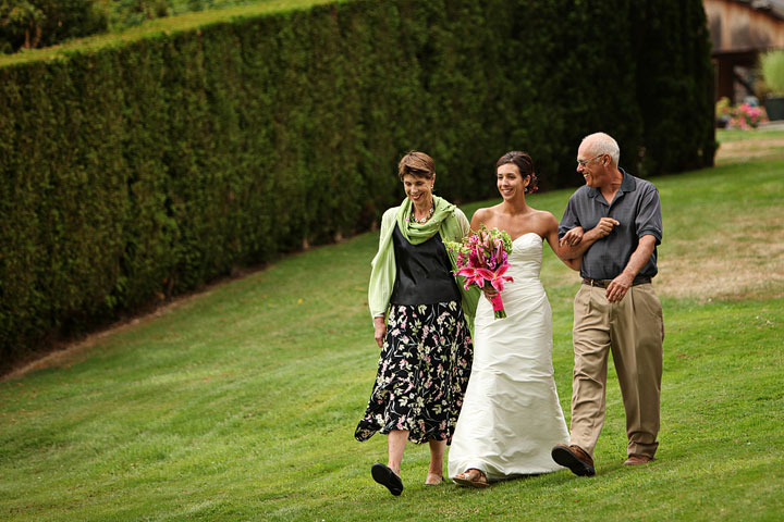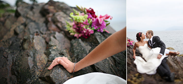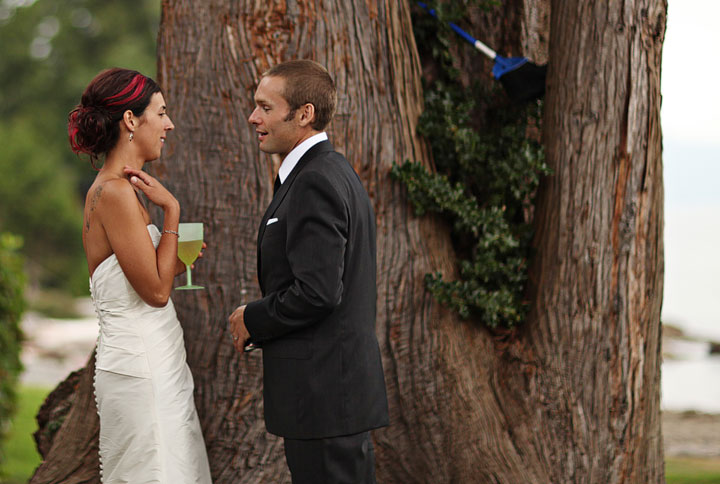 Two Sunshine Coast weddings back to back! Well that’s how it went. This one was set on private property which has been in the bride’s family for a long long time—we knew we were in the right place when street names became family names! The overcast skies gave us some nice soft light for portraits out on the rocky beaches mid day, and the rain held long enough for the ceremony to take place on a beautiful point out into the water without the bridal party having to be covered. Cocktail hour was dry too. It only started to precipitate once everyone was safely under the reception tent, and Katie was able to make some use of her custom designed (she even started the knitting!) pink cardigan. Note the West coast tradition of putting a broom in a tree to hold off rain in the frame below of the bride and groom talking—Jules pointed this out to me—I had never heard of this, but did wonder why there was a broom in a tree when the rest of the property was so immaculately maintained. ( :
